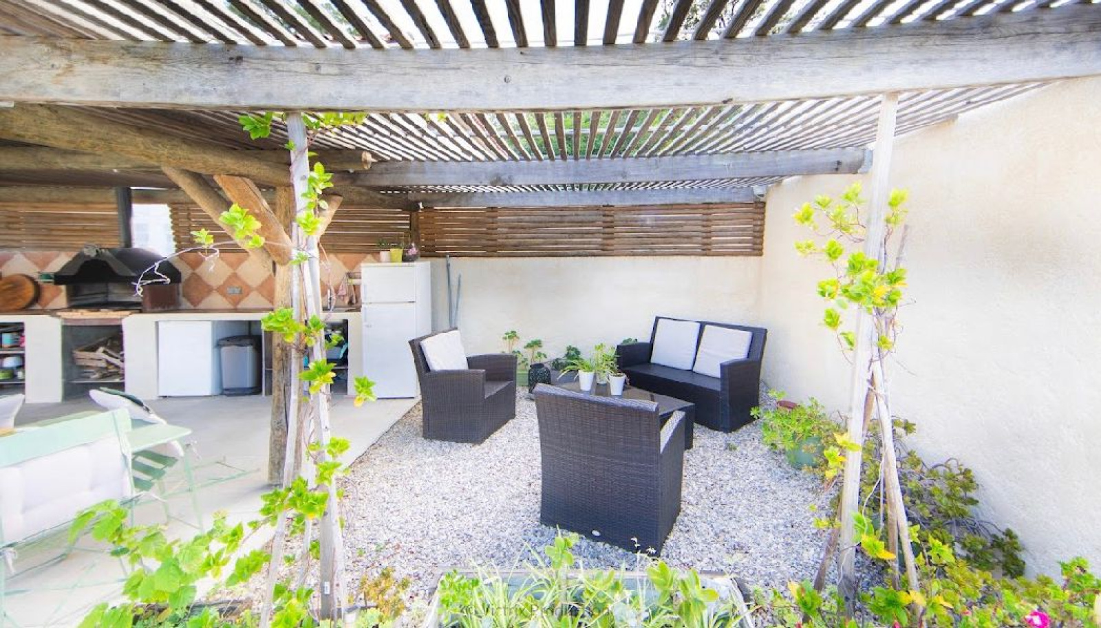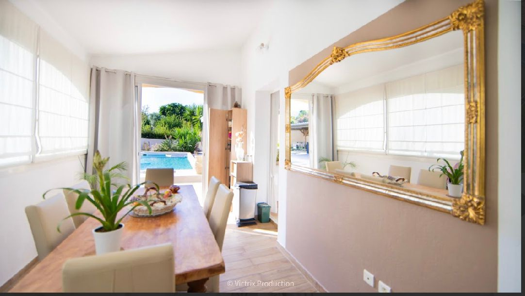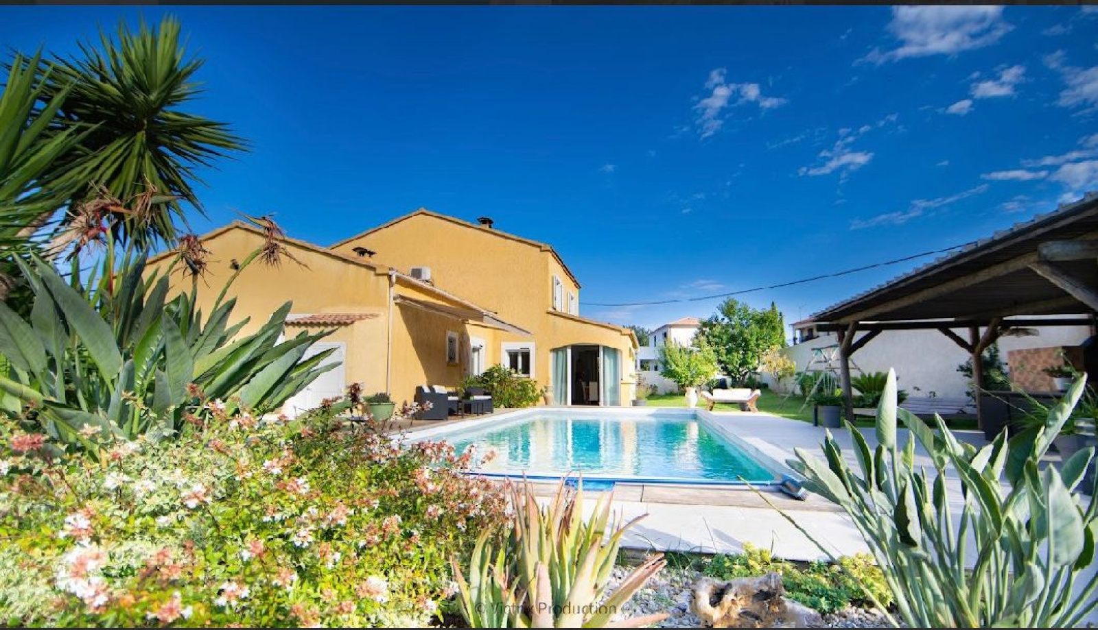 Elle jouie d'une terrasse, d'une belle piscine, d'une cuisine d'été avec babcue et four à pizza et d'un grand garage de 31 m² .